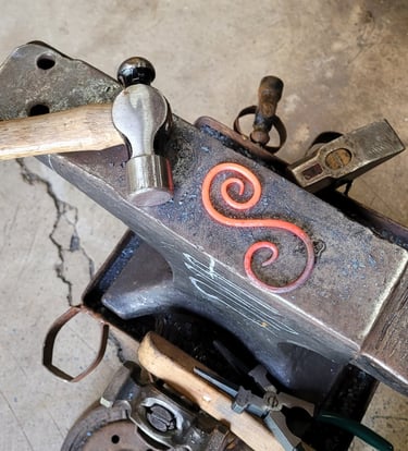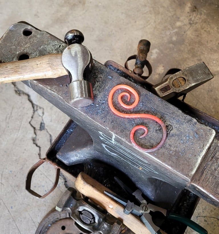 Each piece starts out as a simple piece of metal. Through the process of forging it is transformed into art. Forging consists of the metal being heated up in a very hot forge, until malleable, then it is struck precisely by the blacksmith’s hammer and shaped into its final form. It takes a skilled hand to direct the hammer blows correctly to achieve the desired result.