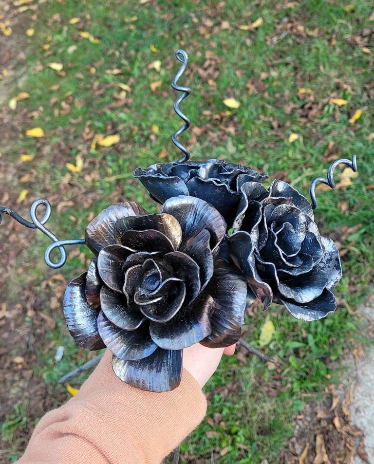 Each piece starts out as a simple piece of metal. Through the process of forging it is transformed into art. Forging consists of the metal being heated up in a very hot forge, until malleable, then it is struck precisely by the blacksmith’s hammer and shaped into its final form. It takes a skilled hand to direct the hammer blows correctly to achieve the desired result.